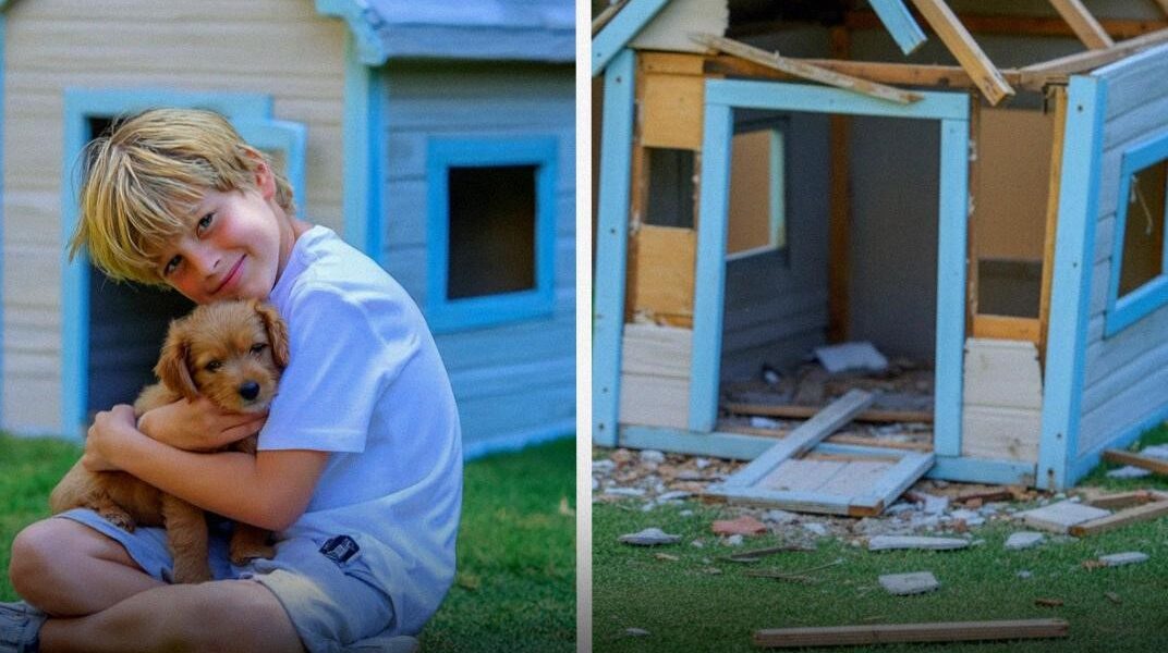 A few days later, Mason came home crying. Buddy’s house had been destroyed — smashed to pieces, blanket soaked, cookie stash ripped apart. Worst of all, Buddy was missing. We found him hiding under the hedge, shaking. And right near Mrs. Henderson’s fence? Fresh dirt and broken pieces of blue wood.