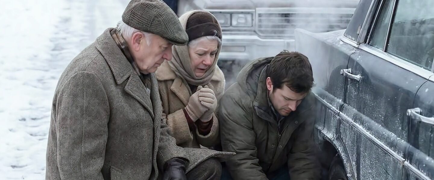 That afternoon, I noticed an old sedan pulled over on the shoulder. A faint mist—smoke or perhaps fog—rose from its engine. Beside it stood an elderly couple, bundled in thin coats that barely shielded them from the biting wind. The man knelt awkwardly by a flat tire, his hands trembling, while the woman hugged herself against the cold.