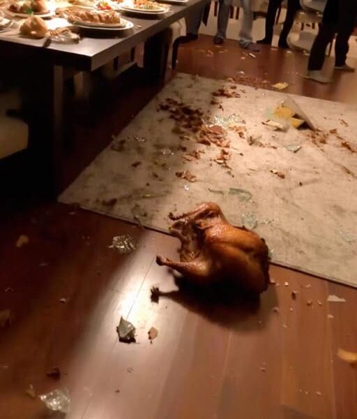 Gasps filled the room as the turkey crashed with a heavy thud. Gravy splattered across the tiles, cranberry sauce smeared on the white ceramic, and a stunned silence fell over the room.