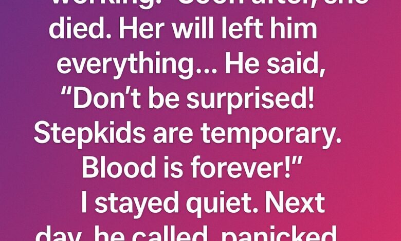 I cared for my stepmom for weeks after her surgery. Her real son was always “too busy working.” When she died, her will left him everything. He smirked and said, “Don’t be surprised. Stepkids are temporary. Blood is forever.”