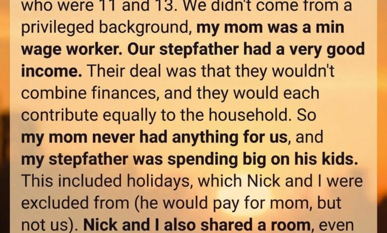 They kept their finances separate and contributed equally to the household—fair on paper, but not in reality. My mom stretched herself thin, while my stepfather maintained the lifestyle his income allowed. His kids had their own rooms, new clothes, and regular vacations. Nick and I shared a room, even though a guest room sat empty. We stayed home during trips our stepfather funded, while my mom joined them without us. We learned early how to make do.