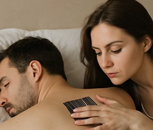 One evening, my husband came home very late. Without a word, he quickly took a shower and almost immediately went to sleep. I lay beside him, wide awake, when I suddenly noticed: he rolled onto his stomach. And there, at the base of his neck, I saw a new tattoo. A barcode. Black lines on his skin.