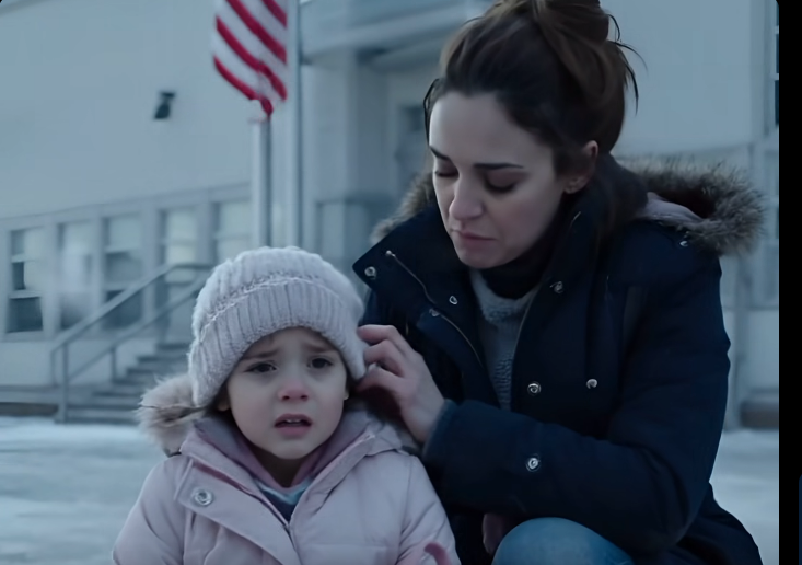 There was just one small figure sitting on the freezing concrete bench near the pickup zone. Lily was wrapped in her thin pink coat, shivering, her eyes red from crying. She looked so small against the gray building, with the American flag out front whipping in the winter wind.