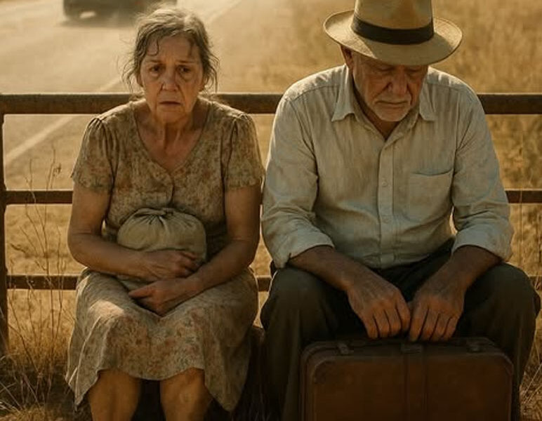A woman in a faded floral dress, sun-bleached after too many summers; beside her, a very old man in a straw hat holding a small suitcase that seemed to carry more years than clothes. Two worn canvas bags rested at their feet like the elbows of an old coat. I slowed by instinct, and before my caution could win the argument, I was already pulling onto the shoulder. When I stepped out, the heat hit me with the smell of dust and engine. I walked toward them, a small cloud of powder rising under my shoes. The woman’s eyes were red and her cheeks marked by dried rivers; the man stared at the ground, as if the answer he’d lost had fallen into the cracks of the road.