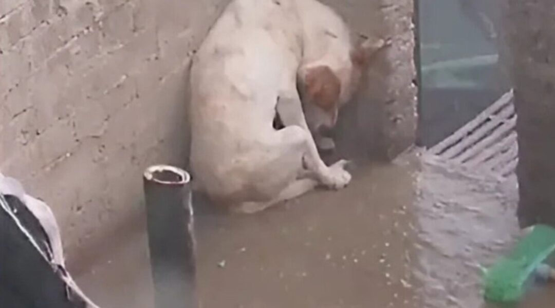 On what should have been an ordinary day, the sky opened up with a heavy downpour. The rain was relentless, and the hail only made it worse. While most families sought shelter inside, this poor dog was left tied up outside, completely exposed to the storm.