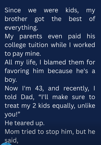 At 43, during a routine family visit, years of buried feelings finally surfaced. In frustration, I told my father I would raise my children differently—making sure they were treated equally.