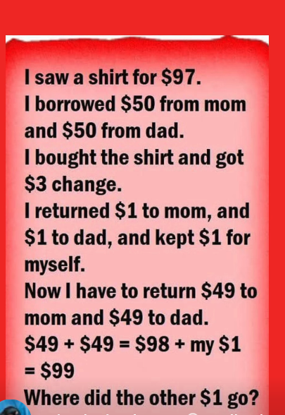 Now, the puzzle says $49 + $49 = $98, and then adds that $1 you kept, bringing the total to $99. Hold up! You’re wondering: where’s that last dollar?