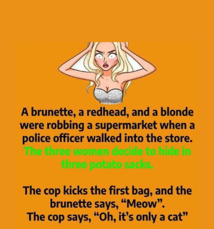 A brunette, a redhead, and a blonde were robbing a supermarket when a police officer walked in. They quickly hid in potato sacks.