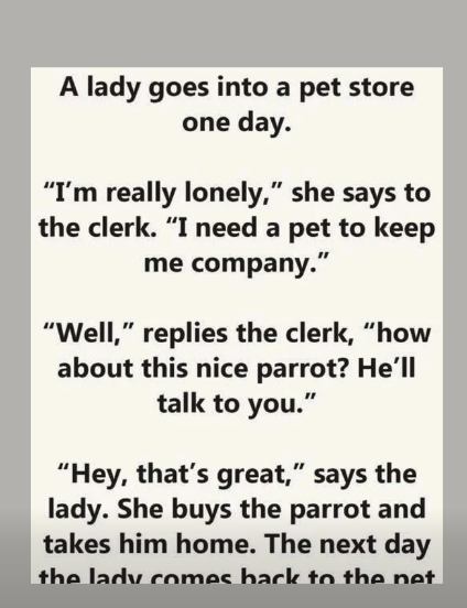 A lonely lady walked into a pet store. “I need a pet to keep me company,” she said.