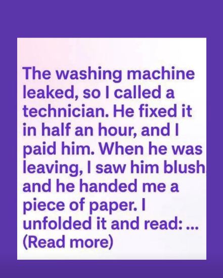 The washing machine leaked, so I called a technician. He fixed it in half an hour and, as he was leaving, handed me a folded note, blushing.