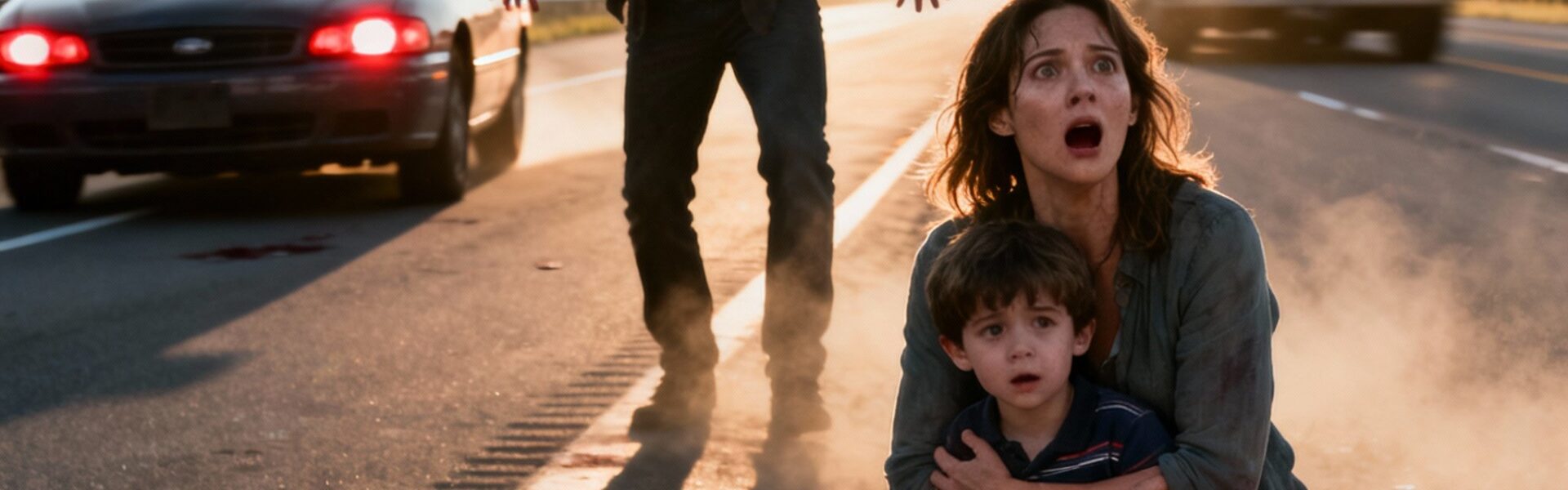 He didn’t stop. He pushed us down the slope off the shoulder, toward the ditch where the grass was tall and wet. Then he shoved us lower, forcing us to crouch.