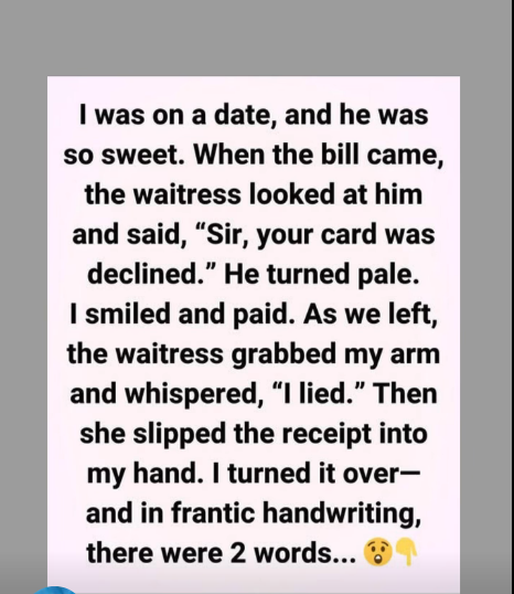 The restaurant was warm and dimly lit, the kind meant to feel romantic. When the bill arrived, the waitress leaned in and whispered, “Sir… I’m so sorry. Your card was declined.”