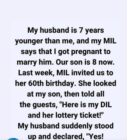 My husband is seven years younger than me, and for years my mother-in-law claimed I got pregnant just to marry him. Our son is eight now. Last week, she invited us to her 60th birthday and, in front of everyone, pointed at my son and said,