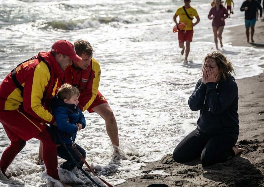 The entire beach seemed to hold its breath as Evan was dragged back toward shore, coughing, choking, eyes wide with terror, his small chest heaving as saltwater poured from his mouth.