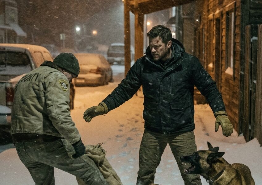 They were walking past the closed Rusted Spur bar when Atlas stopped short, muscles coiling, a low growl vibrating through his chest, not loud enough to draw attention but sharp enough to cut through the wind like a warning wire, and Lucas followed the dog’s gaze to the alley half-buried in snow where a man in a county jacket was kicking something soft with the toe of his boot, muttering to himself like the night owed him answers.