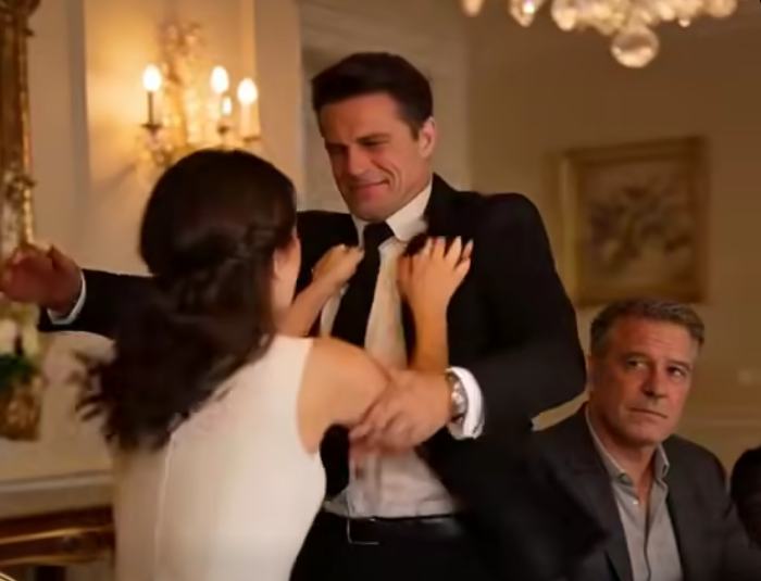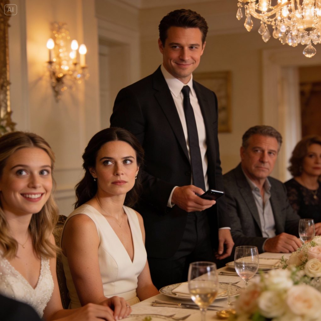 I turned slowly toward my fiancé, Ethan, who had been sitting quietly beside me. He had listened without interruption, his expression calm, almost amused. He reached for his phone, stood up, and smiled gently.