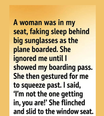 Nothing—until I held my boarding pass in front of her face. She “woke up,” annoyed, and gestured for me to squeeze past her. I didn’t.
