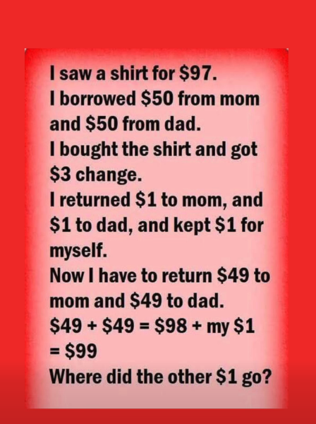 “You owe $98, and you kept $1, so that makes $99. Where did the other dollar go?”