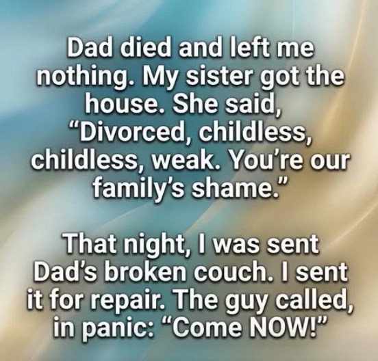My sister inherited the house, and I was handed nothing but cruel words and an old, broken couch. That night, alone with my grief and anger, I sent the couch to a repair shop, thinking it was the last useless thing tied to a life where I never quite measured up. I had no idea that inside its torn cushions was a secret my father had been carrying for years—one that would completely change how I understood him, and myself.