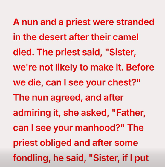 A nun and a priest found themselves stranded in the desert after their camel passed away. The priest, sensing the gravity of the moment, looked at the nun and said, “Sister, it seems we may not survive this.” “Can I see your chest before we die?”
