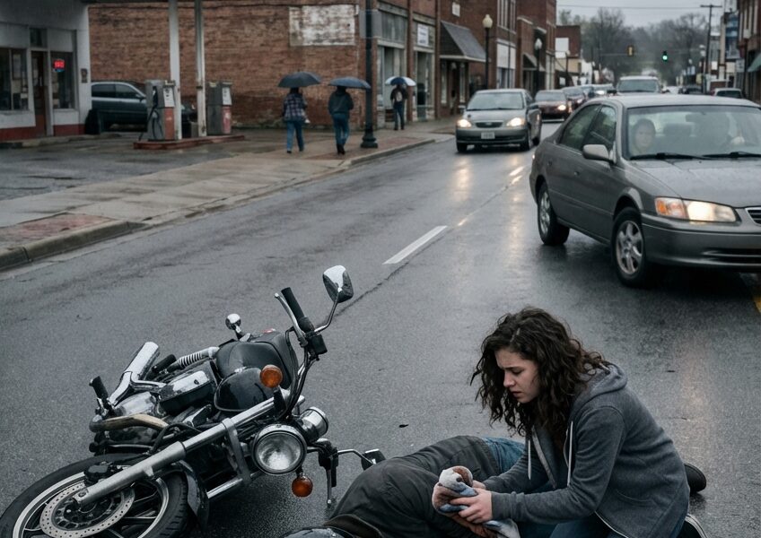 The accident itself was not dramatic in the cinematic sense. There was no explosion, no theatrical spray of sparks. Just a sharp, sickening skid, a sudden sideways slide, and then the hollow crack of metal hitting asphalt. The motorcycle spun once, almost lazily, before collapsing onto its side, its rear wheel still twitching faintly. The rider followed, thrown hard enough that his helmet struck the pavement with a sound that would later replay in the mind of the only person who truly heard it.