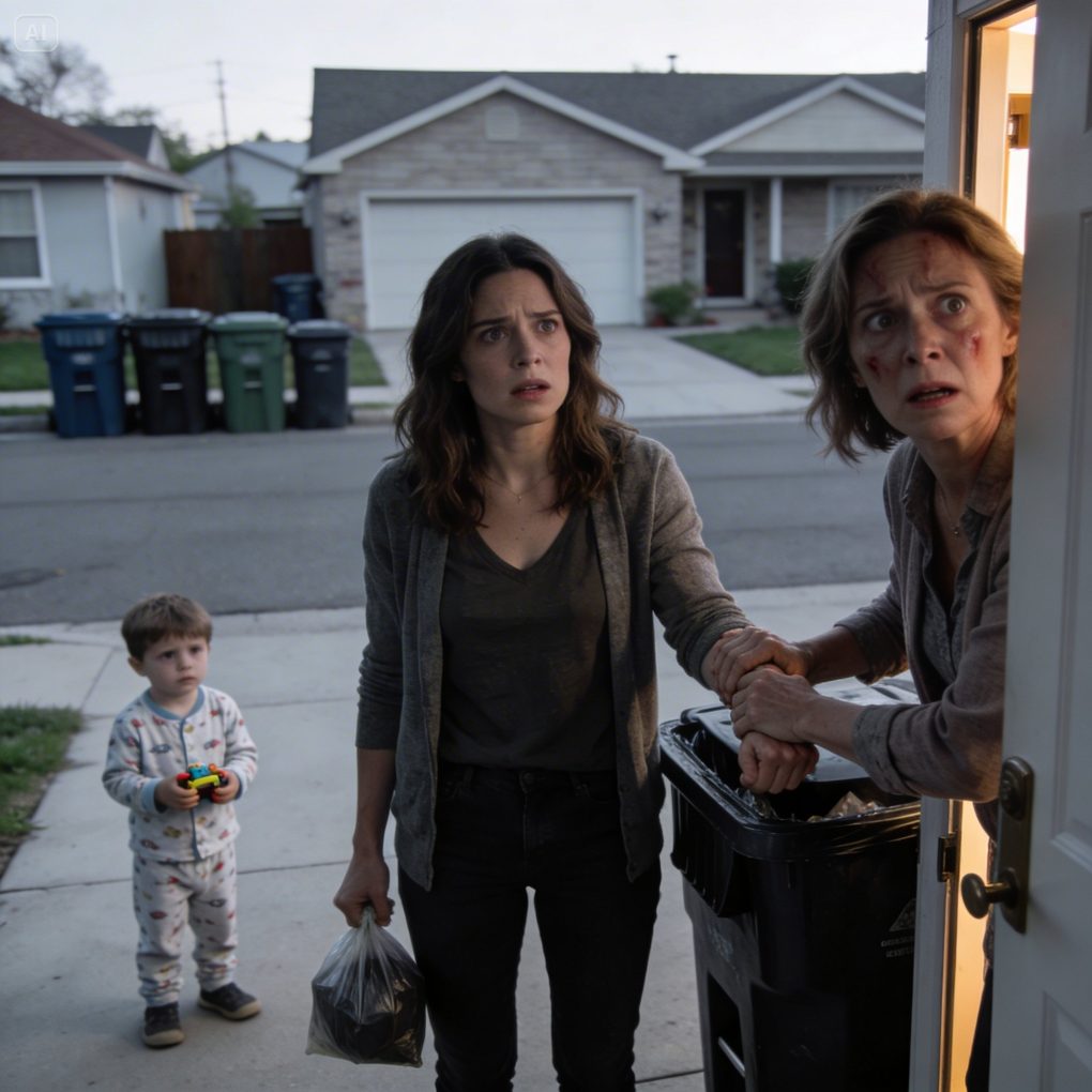 Sunlight slipped across the driveway. The air smelled like cut grass and someone’s coffee drifting through an open window. I carried the trash bag out with one hand, my phone in the other, already thinking about daycare drop-off and the grocery list I’d forgotten to write.