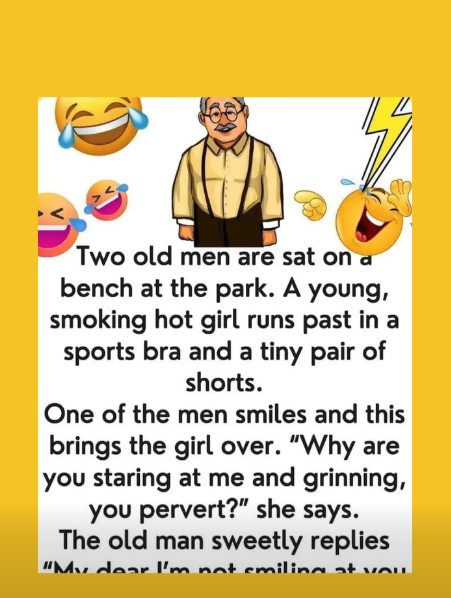 Two old men are sat on a bench at the park. A young, smoking hot girl runs past in a sports bra and a tiny pair of shorts. One of the men smiles and this brings the girl over.
