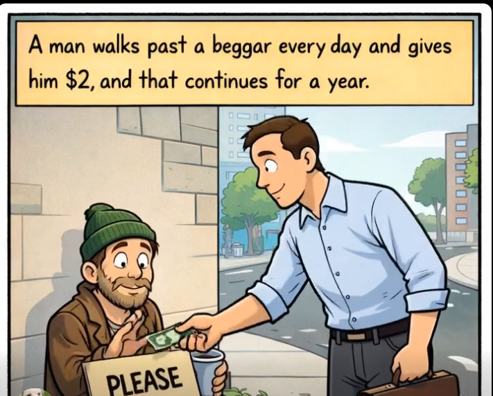 A man walks past a beggar every day and gives him $2, and that continues for a year.