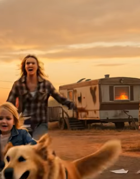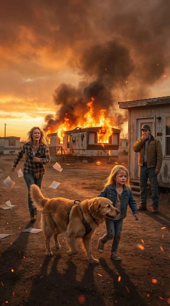 The world seemed to tilt sideways as I ran toward our trailer. The smoke rising from the small kitchen window was thick and dark, swirling up into the late afternoon sky like a warning. “Lily!” I screamed as I sprinted across the gravel road. Neighbors were already rushing outside their trailers, some shouting, some grabbing hoses, others simply staring in shock. Rick came running out of the office behind me. “Call 911!” someone yelled. My entire body felt numb except for the pounding of my heart. I reached the front steps of the trailer and tried to open the door, but heat blasted against my face as soon as I touched the handle. Flames flickered inside the small living room. “Lily!” I screamed again, panic choking my voice. I could barely see through the smoke pouring from the doorway. Someone grabbed my arm from behind. “You can’t go in there!” a neighbor shouted. I fought against his grip desperately. “My daughter’s inside!” The man hesitated, but the flames crackling through the kitchen made it clear how dangerous it was. I could hear something collapsing inside the trailer. A cabinet, maybe. Or worse. My knees nearly buckled as the terrible thought crashed into my mind: I had just signed away the only creature that might have protected her. Max had always followed Lily everywhere. If he had been inside… maybe he would have stayed with her. I covered my mouth with my shaking hands. “Please,” I whispered to no one in particular. Then suddenly the front door burst open. For a split second, the flames seemed to push outward with the rush of air. And out of the smoke came a dark shape moving fast across the floor. It was Max. His fur was covered in ash and his eyes were wide with urgency. But he wasn’t alone. The collar of Lily’s jacket was clenched gently in his teeth as he dragged her across the porch steps. Lily coughed violently but was conscious. The moment Max pulled her onto the gravel, he released the jacket and barked loudly. I dropped to my knees beside them, pulling Lily into my arms while tears streamed down my face. “Mommy!” she cried. “Max wouldn’t let me stay inside!” My arms wrapped tightly around both of them. Max panted heavily beside us, his tail wagging weakly despite the smoke clinging to his fur. Behind us, Rick stood frozen near the office door, staring at the scene in disbelief. And suddenly that signed document in his folder didn’t seem quite as certain as it had just ten minutes earlier.