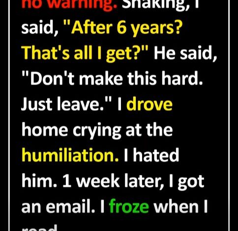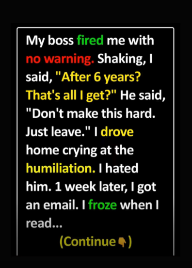 My boss fired me without warning. Six years—gone in minutes. He told me not to “make it harder,” and I left shaking, humiliated. I cried the whole drive home and spent days angry at him.