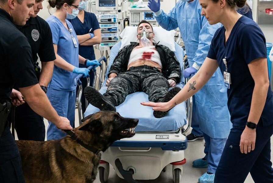 The K9 fiercely guarded the wounded SEAL’s body, refusing to let anyone come near. Everything changed when a new nurse revealed a tattoo, triggering a response that shifted the tense situation in a way no one expected.