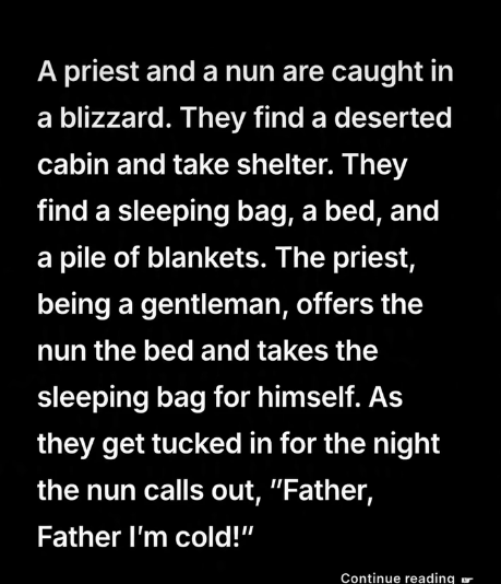 The priest thinks long about this and finally says, “Sister, we are in the middle of nowhere in a blizzard. No one but you, myself, and the lord himself will ever know what happens here this night. How about, just for this night, we act as though we were married?”