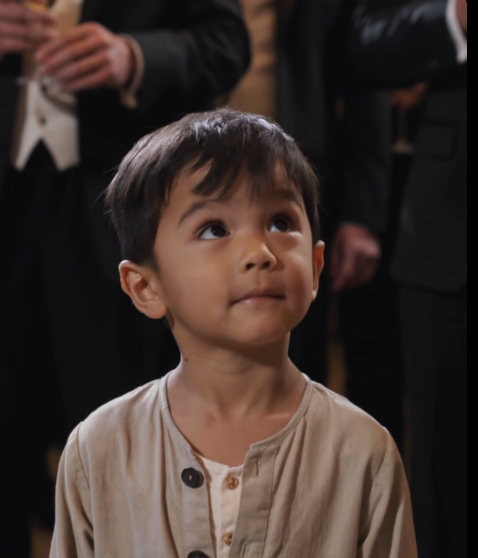 Standing near the entrance was a thin boy, about nine years old. His clothes were torn and stained. His shoes were worn out, the soles nearly peeling. His dark hair was messy, and his cheeks were slightly dirty as if he had come straight from the street.