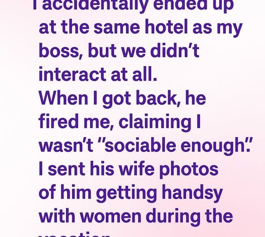 However, when I got back, everything changed. My boss called me into his office and abruptly fired me. His reason? He claimed I “wasn’t sociable enough” during the trip. I was stunned. My performance had always been strong, and the vacation wasn’t a work event. It felt unfair and personal. That’s when I remembered the photos I had seen during my stay—photos of him acting inappropriately with strangers at the hotel bar.