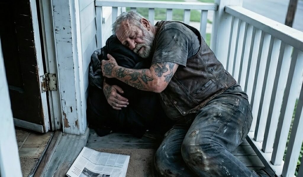 At 5 AM, I stepped outside to get the paper and nearly tripped over a man curled up on my porch. He was huge, dressed in torn biker leather, with a gray beard matted with blood. My first instinct was to call the police, but I noticed a note in his hand with my name on it. It identified him as Thomas Morrison, a retired Staff Sergeant who had served with my son, David, in Afghanistan. David died twelve years ago, and the Army always told me it was instant. Seeing this broken stranger claiming to have a message made my heart stop. I ignored the fear telling me to stay away and grabbed a first aid kit, deciding to trust the man who had finally found me.